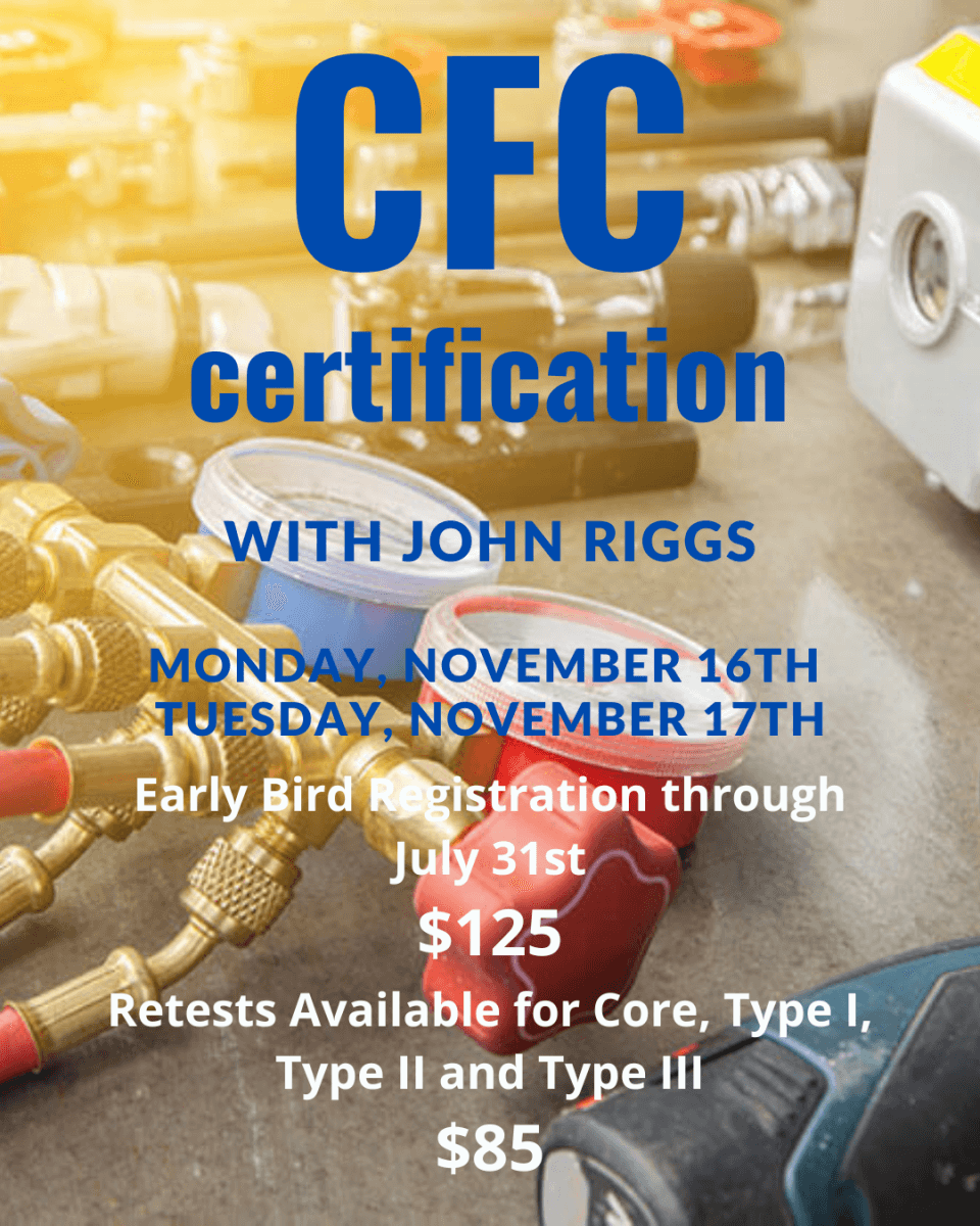 This certification course will include 12 hours of instruction followed by 4 hours for testing for certification in one or all of the following: Type I, Type II, Type III, and Universal certification in the use of EPA-regulated refrigerant gases. Attendees will be instructed in the rules and regulations that meet compliance with the EPA refrigerant recycling rules. All instruction materials will be provided.